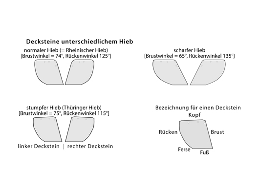Für die Altdeutsche Deckung können Decksteine mit normalem, scharfem sowie stumpfem Hieb verwendet werden (Prinzipskizze unten). Die Decksteine sind mit hängender Ferse und Fersenversatz zu verdecken. Die Deckung muss mit Decksteinen ausgeführt werden die deutliche Unterschiede in Höhe und Breite aufweisen.