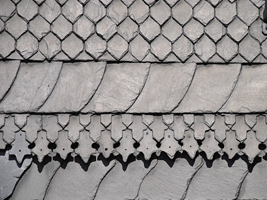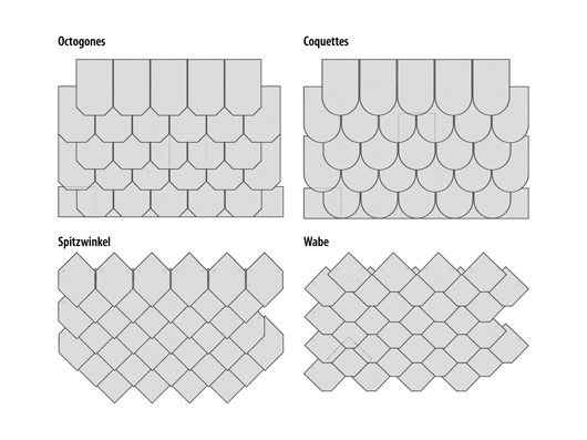 neben den verschiedenen Formaten auch Ornamente eingebunden werden können.In erster Linie werden die Formate Bogenschnitt 20x20 bzw. 25x25 oder Rechteckdeckungen bei Fassaden verwendet. Fassaden können noch mit Schmuckbändern oder anderen dekorativen Details wie z.B. Ornamenten kombiniert werden.