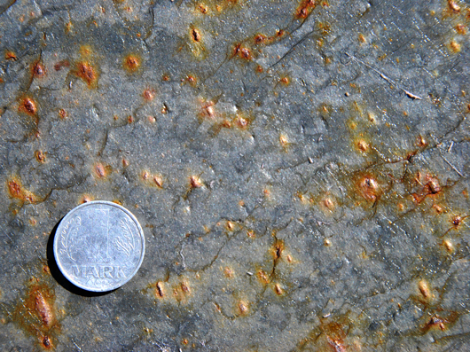Manchmal zeigen rote Schiefer grünliche Punkte oder Bereiche die Ergebnisse von Reduktionsprozessen sind.