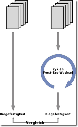 Frost - Tau - Wechsel - Beständigkeit In diesem Test wird mit 20 Paaren an Prüfkörpern die Veränderung der Biegefestigkeit nach der Durchführung des Frost-Tau-Wechsels festgestellt. Die 20 Paare sind in zwei Gruppen aufzuteilen, wobei von 10 Paaren die Biegefestigkeit ohne vorhergehende Beanspruchung analysiert wird. Die anderen 10 Paare müssen insgesamt 100 Frost-Tau-Wechsel-Zyklen ausgesetzt werden. Anschließend wird die Biegefestigkeit und deren mögliche Veränderung festgestellt. Jetzt werden die Biegefestigkeiten der jeweiligen 10 Paare verglichen.