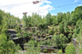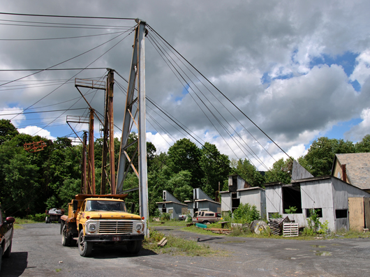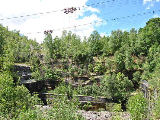 • Abb. 3 Kabelanlagen zum Fördern von Schieferblöcken und Bergleuten aus den Schiefergruben in Pen Argyl. Im Grund handelt es sich um offene Schächte und dieser hier hat eine aktuelle Tiefe von ca. 150 m.