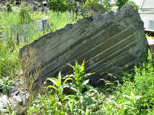 • Abb. 9 Schiefern aus der "soft slate" Einheit bekommen einen matten Farbton und oft ist eine Delamination, das Abschiefern von der Oberfläche her zu beobachten (Danielsville)