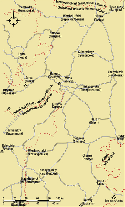 Es existiert kein Abbau von Dachschiefer im Ural. Umfangreiche Untersuchungen bezüglich eines möglichen Abbaus und potenziellen Produkten wurden im Oblast Tscheljabinsk im südlichen Ural von Malachow im Jahre 1930 durchgeführt. Die Schiefer befinden sich im Tal des Miass Flusses ca. 16 km südwestlich der Stadt Miass und 13 km südlich der Bahnstation von Syrostan. Schächte wurden weiter südlich abgeteuft und die Exploration betraf das Gebiet der Nurali Bergkette am Atljan Fluss. Die Schiefervorkommen stellen einen NO-SW streichenden schmalen Steifen dar. Die sehr inhomogenene Ablagerungen umfassen zwei Schieferqualitäten. Einmal Schiefer die man in in dünne Schieferplatten spalten kann und dann Schiefer mit Spaltstärken zwischen 2-3 cm. Letztere werden auch als Schallsteine bezeichnet, was auf eine höhere Härte verweist. Die Schiefer zeigen generell eine gute Spaltbarkeit mit einer glatten und seidig-glänzenden Überflächee. Während der Testpoduktion wurden Schieferplatten in deutschen, französischen und englischen Formaten hergestellt.