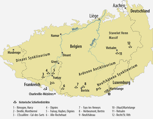Die Dachschiefer sind ein Ergebnis beider Gebirgsbildungen. Der größte Teil des Schiefers wurde in devonischen Gesteinseinheiten abgebaut wie im Schiefergürtel der Ardennen, aber auch in ordovizianischen Einheiten bei Vielsalm oder im Rocroi-Massiv.