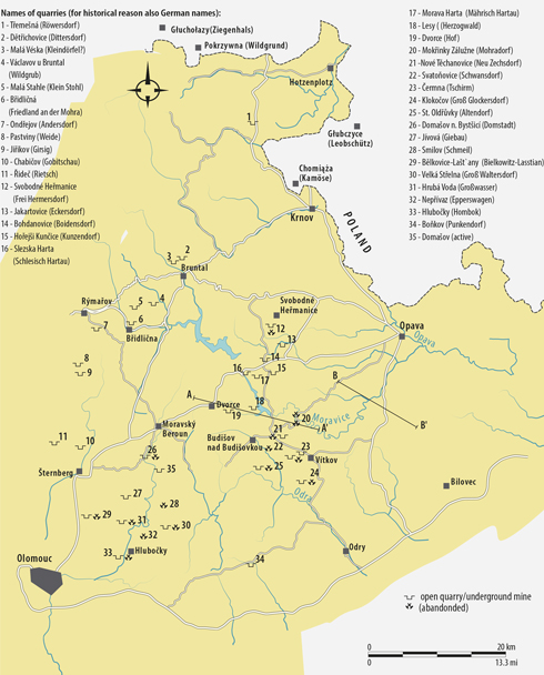 Die Schiefervorkommen Mährens liegen im Osten der Tschechischen Republik, zwischen Olomouc (Olmütz) und Opava bzw. Olomouc, Sternberk und Bruntal (Freudenthaal). Der Schiefer zeichnet sich durch eine hellgraue Farbe, mit teilweise leicht bläulichem